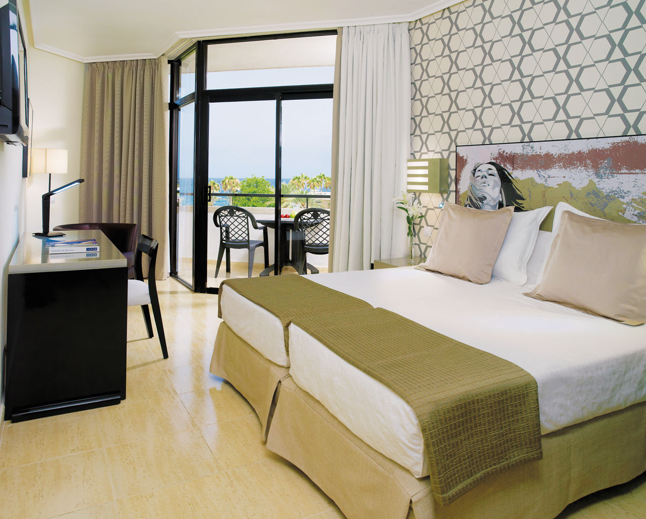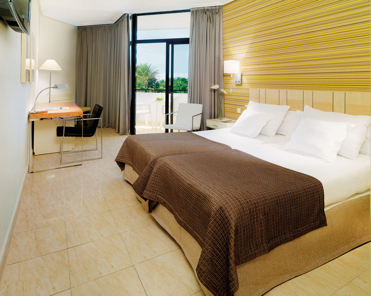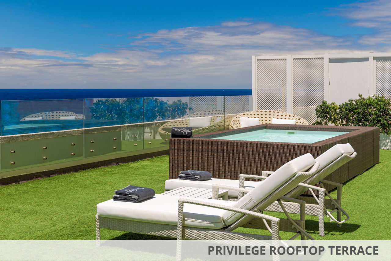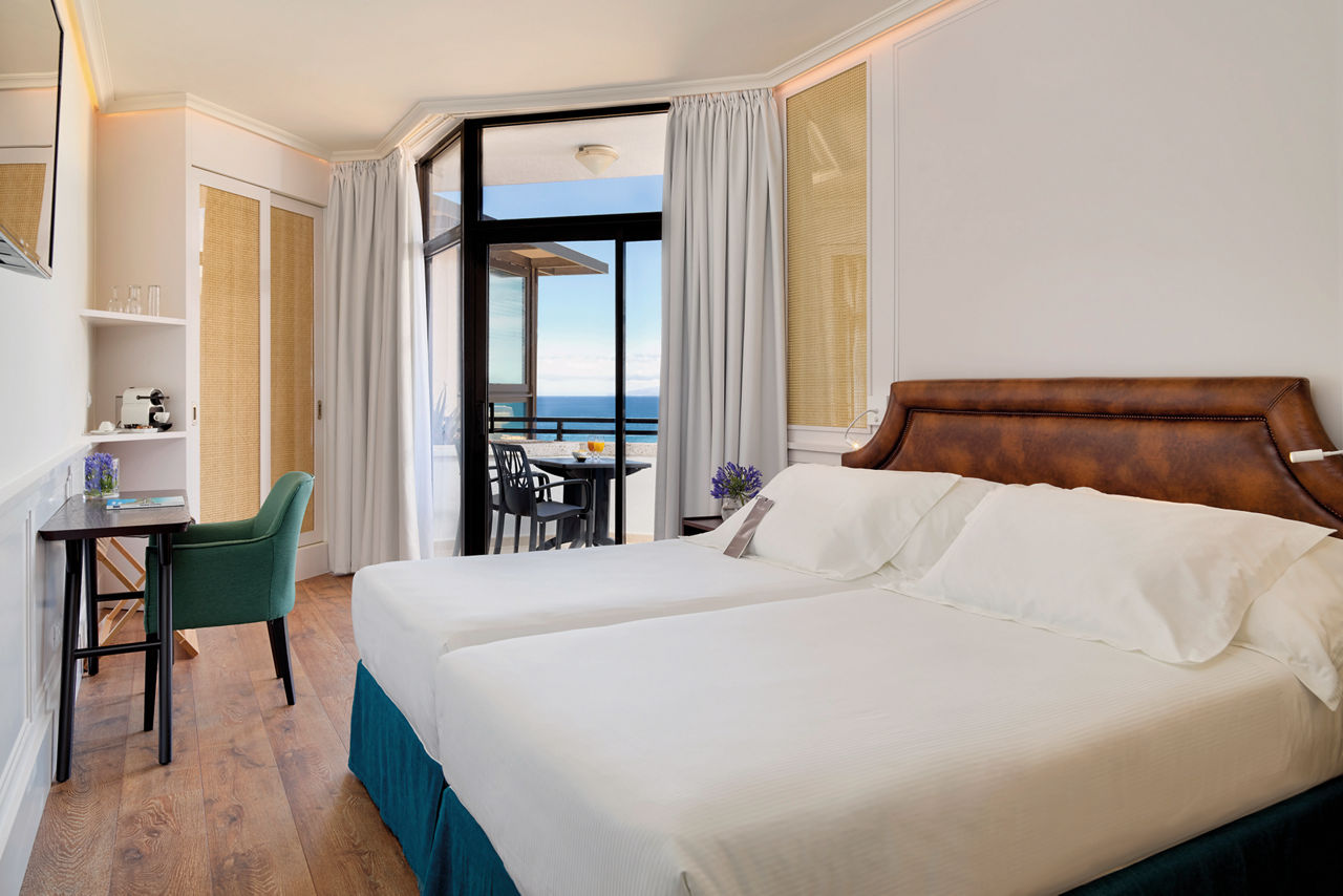 Double rooms sleep up to 3 adults or 2 adults and 1 child and have a bathroom with bath or shower, air conditioning, satellite TV, hairdryer and terrace or balcony. Double rooms with Sea View and Junior suites sleeping 3 adults or 2 adults and 2 children, Superior Privilege rooms which are the same as Double rooms but for adults only and with double or twin beds and exclusive lounge and terrace access and Double rooms for Sole Use are also available.