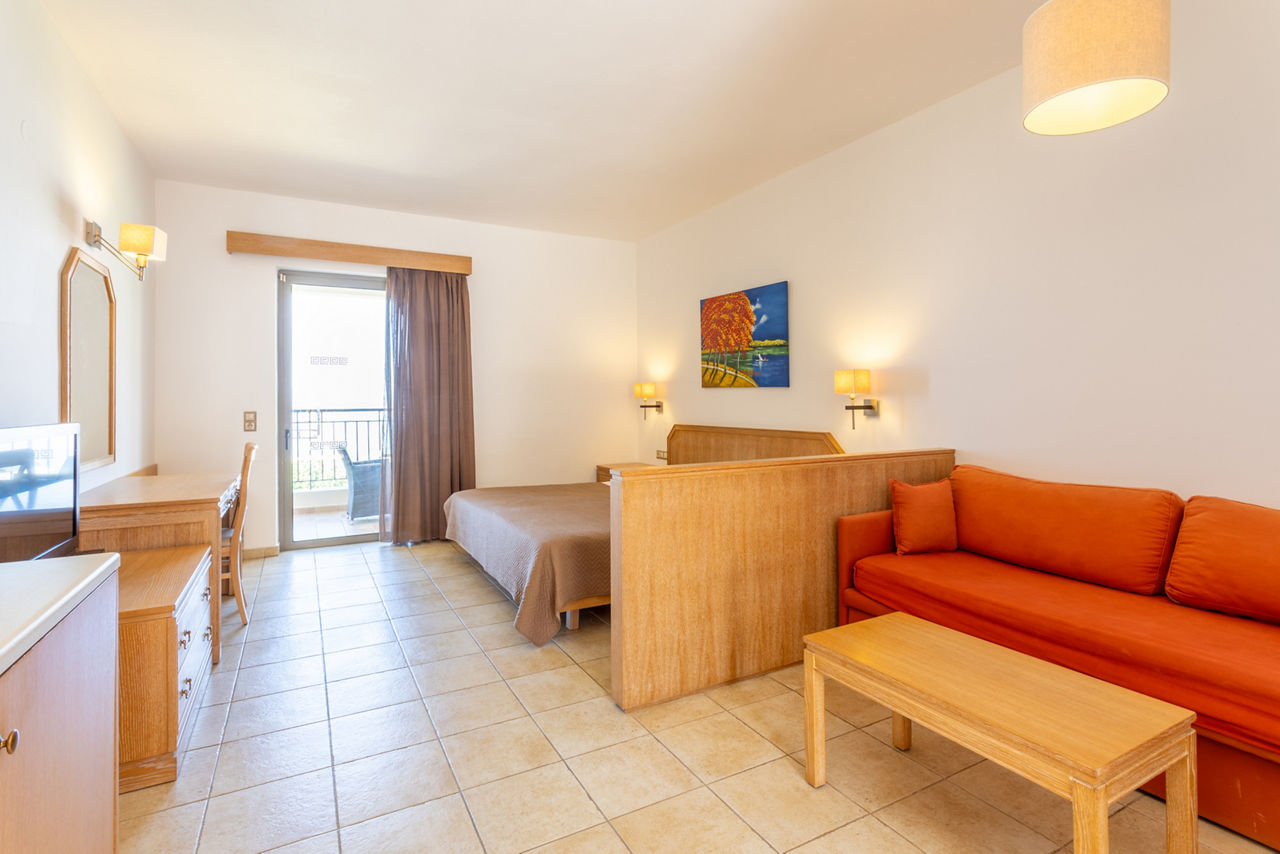 Studios sleep up to 3 adults and have bathroom containing a bath with shower attachment, air conditioning*, hairdryer, fridge, safety deposit box* and balcony.