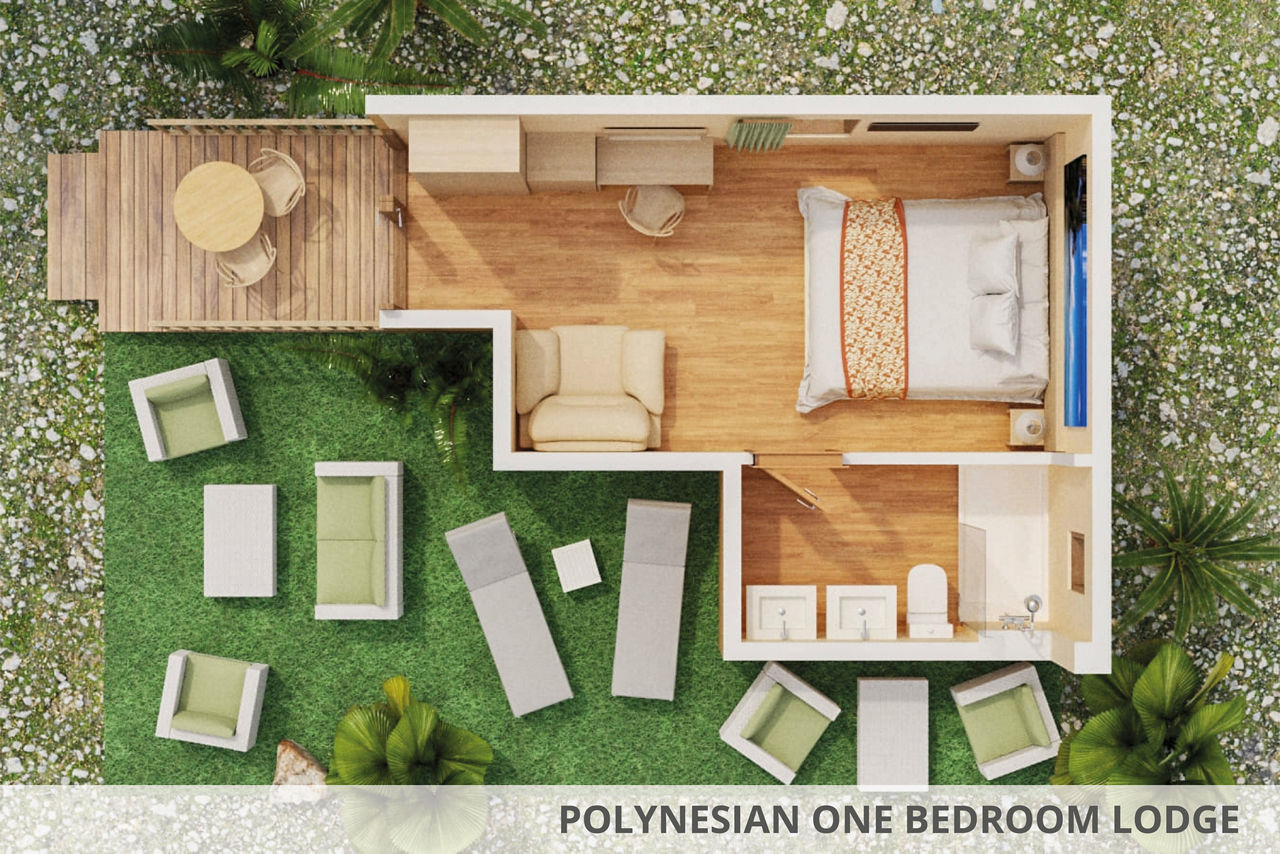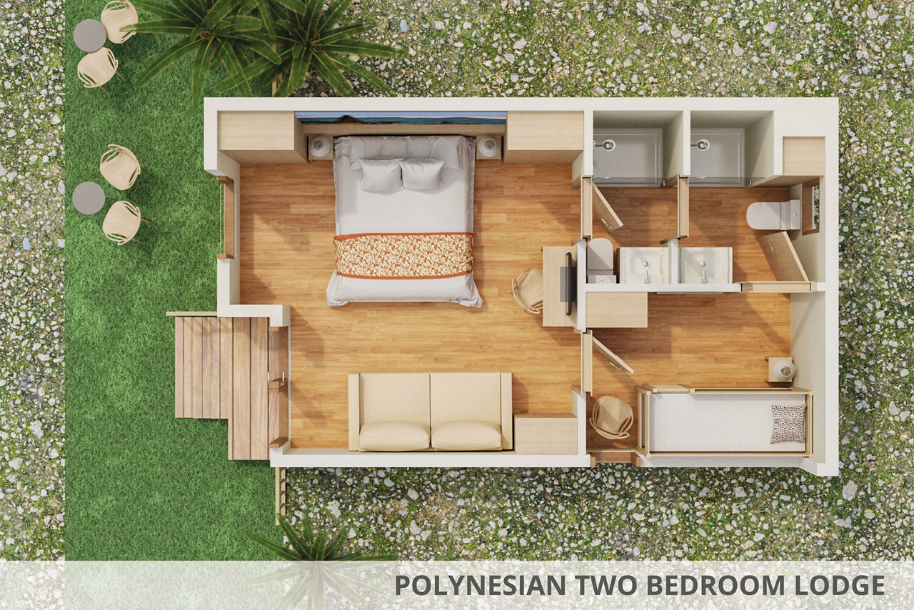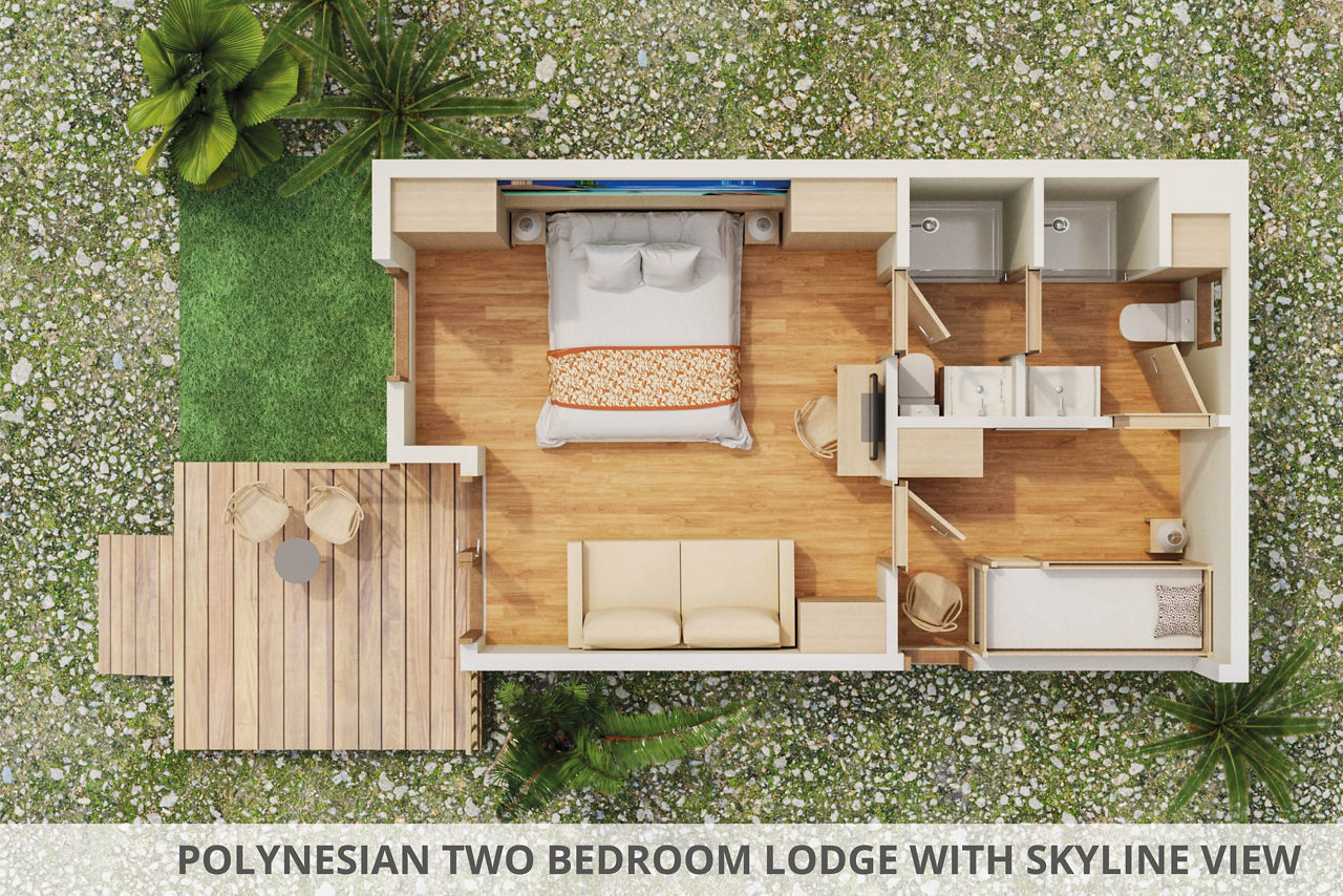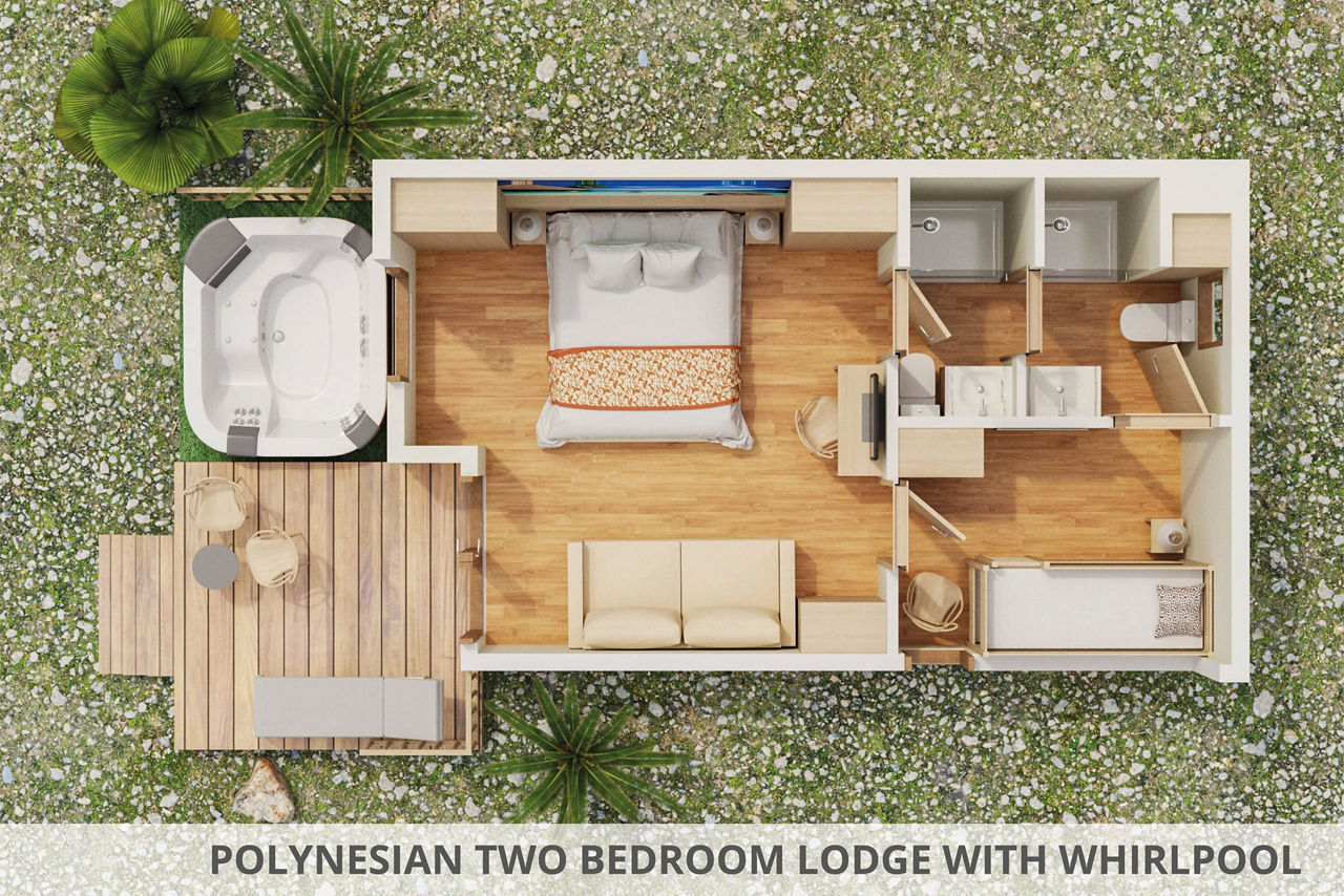 Polynesia Standard One Bedroom lodges sleep up to 2 adults and 1 child and have a bathroom with shower, TV, air conditioning and minibar. Polynesia Standard Two Bedroom lodges sleeping up to 3 adults and 2 children and Polynesia Standard Three Bedroom lodges sleeping up to 5 adults and 2 children are also available.
