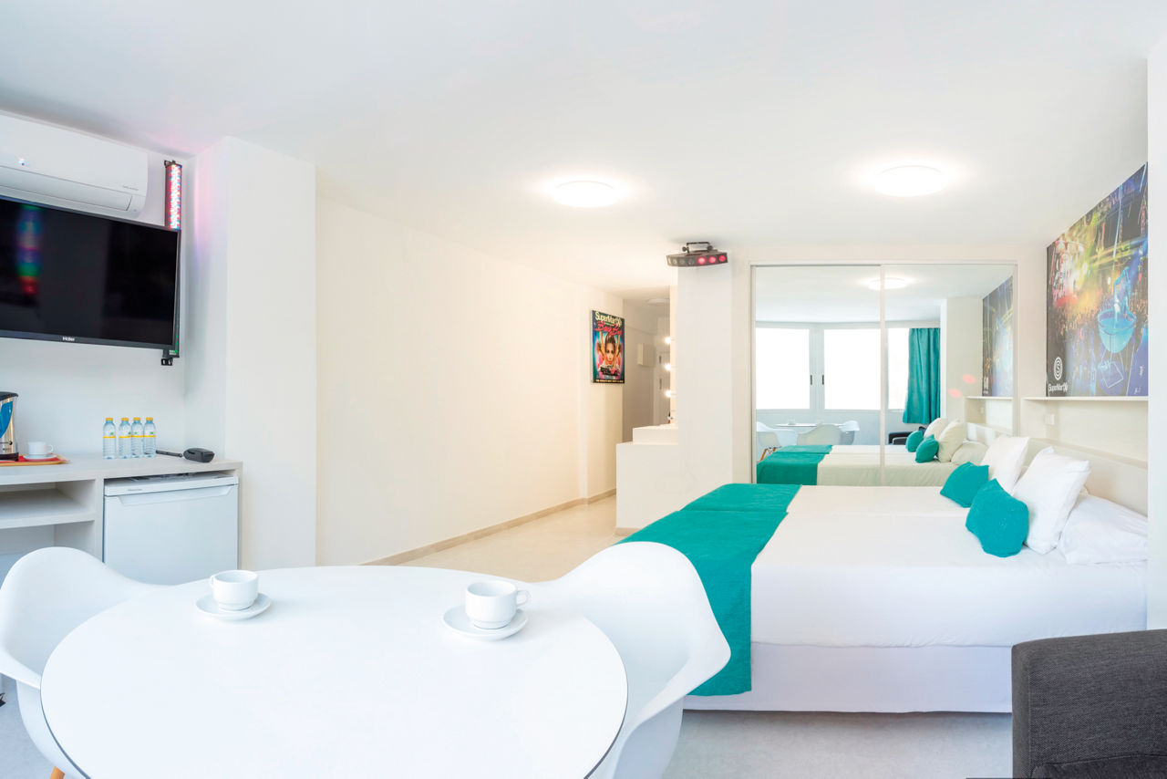 The clue?s in the name at BC Music Resort. Large apartments have space for 6, great for groups. Bag a Bali bed and laze as live DJs mix the latest tunes. When night falls, go-go dancers and entertainers steal the show. Ready to head out? The main square?s 1.5km away.One Bedroom apartments sleep up to 5 adults and have a one bedroom with double or twin beds, separate living area with twin beds and sofa bed, bathroom containing a bath, air conditioning (29 Jul-08 Sep), safety deposit box*, television and microwave. Two Bedroom apartments sleeping up to 6 adults and have two bedrooms, one with a double bed and one with single bed and a separate living area with twin beds and sofa bed are also available.