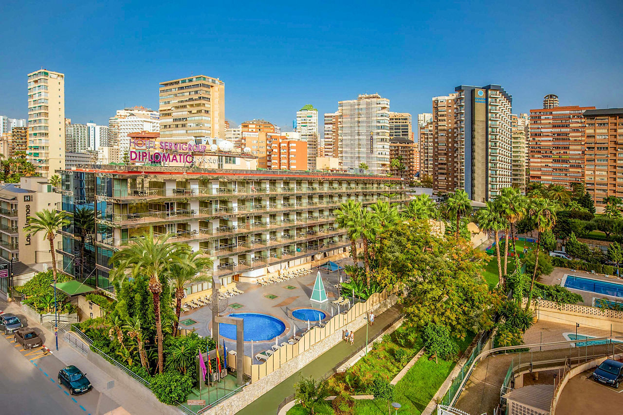 The Hotel Servigroup Diplomatic is in the Levante area of Benidorm only 220 metres from the golden beach and located close to a variety of bars and restaurants. The hotel boasts a range of swimming pools as well as a spa with a gym, sauna, whirlpool, treatments and an indoor pool so whether you travel in summer or winter, you a very well catered for at this much loved hotel.Twin rooms sleep up to 3 adults and have air conditioning, full bathroom, satellite TV, mini-fridge, and a balcony. Single rooms and twin rooms for sole use are also available