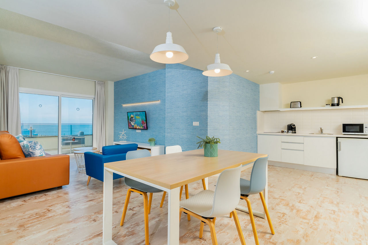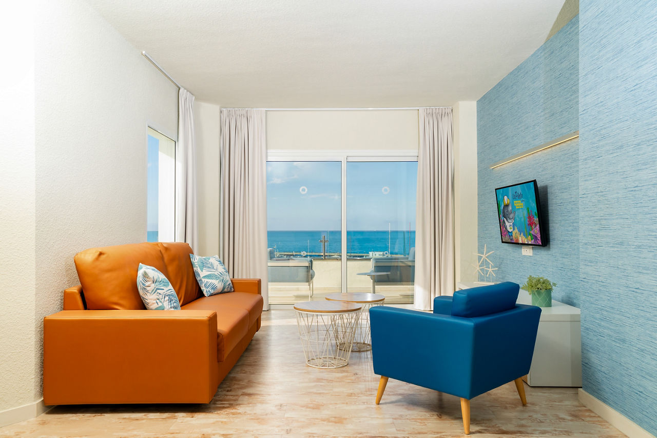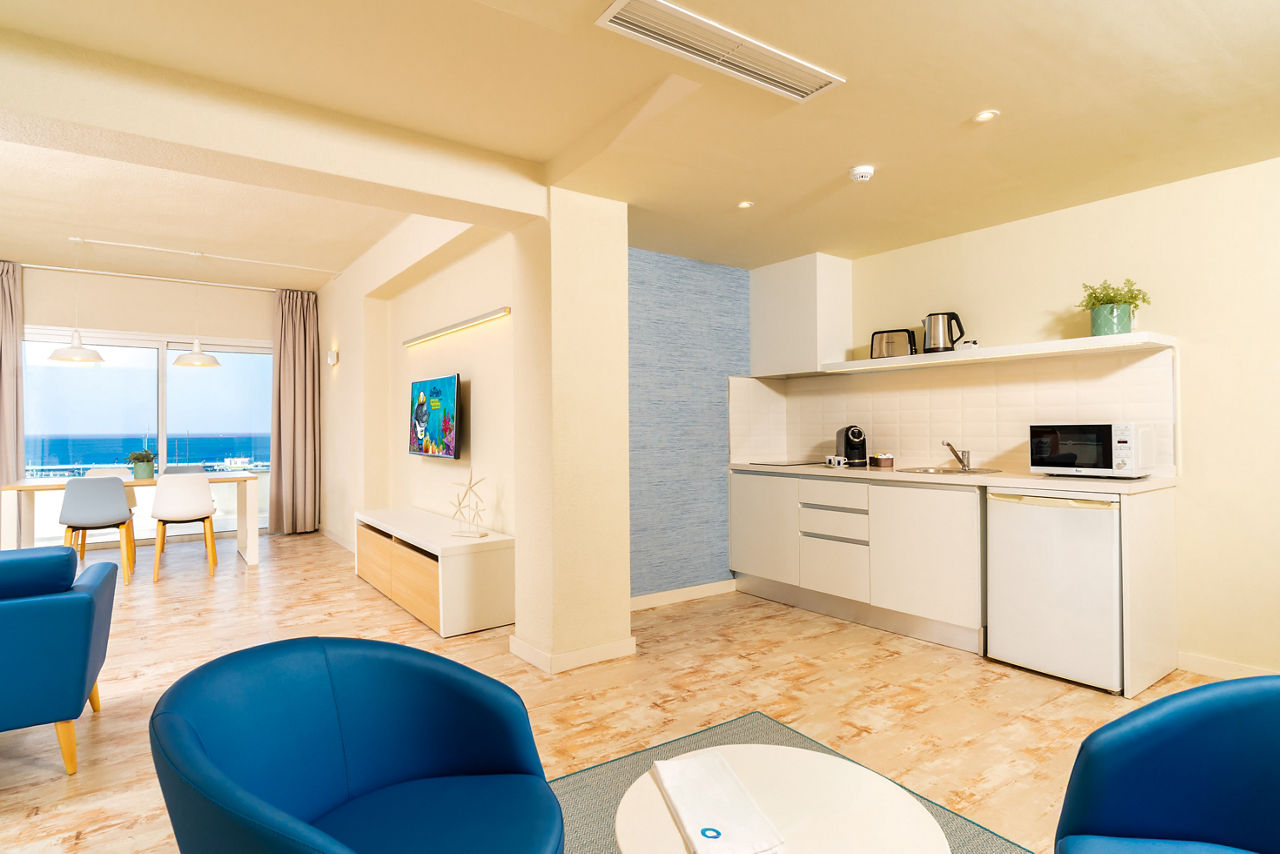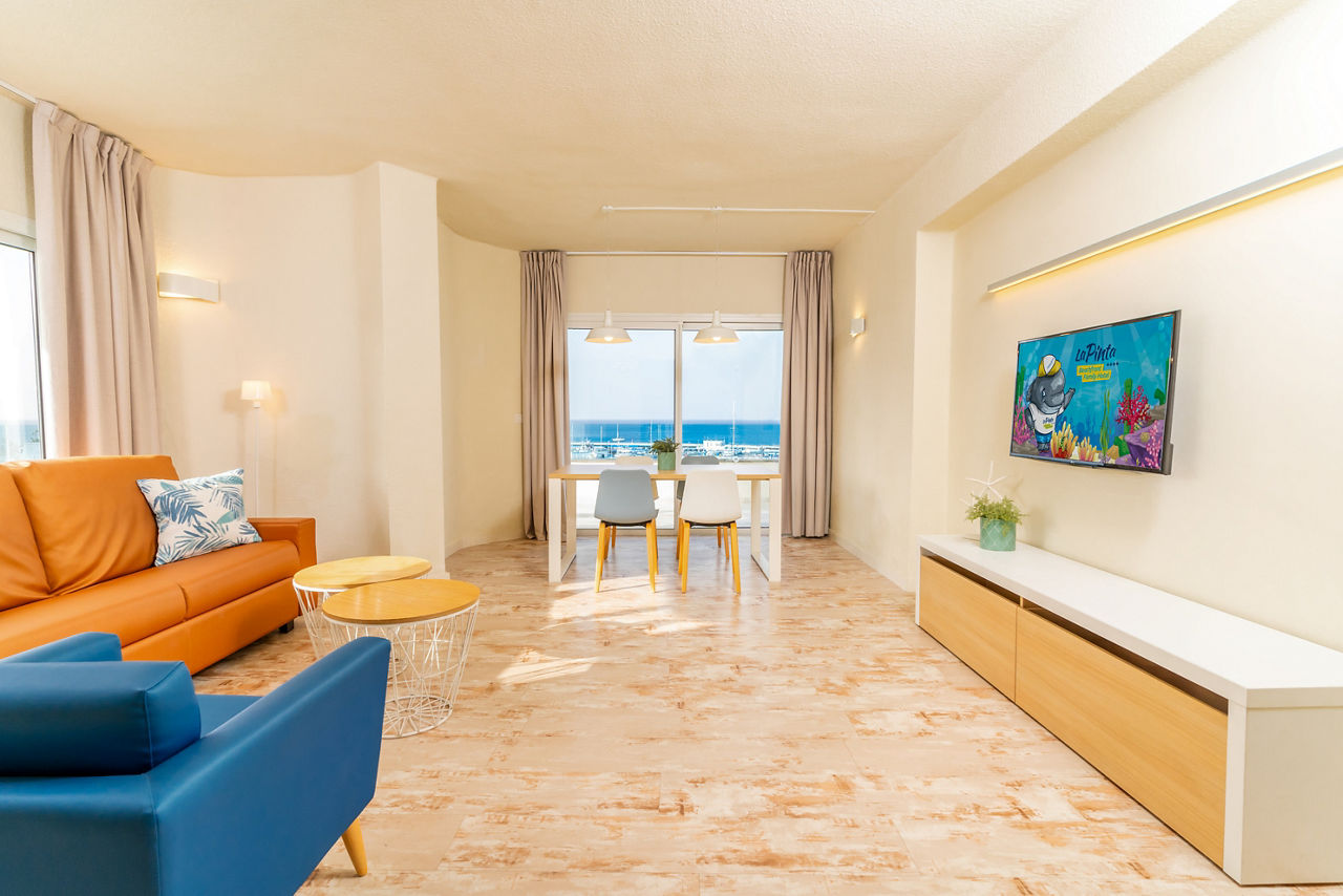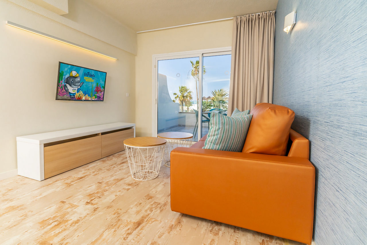 HOVIMA La Pinta Beachfront Family Hotel is a colourful, fun and friendly hotel with modern style throughout. Taking inspiration from its stunning beachfront location, this hotel uses nautical colours throughout and has under the sea themed decorations including a huge painted mural and interactive virtual aquarium. Featuring a children?s club, playground and Family rooms which have direct access to the children?s splash park or garden, this hotel is ideal for those travelling with little ones.Comfort One Bedroom apartments sleep up to 3 adults or 2 adults and 2 children and have bathroom containing a shower, air conditioning, hairdryer, flat screen television, fridge, kettle, toaster, microwave and balcony or terrace. Room upgrade options and Sole Use rooms are also available.